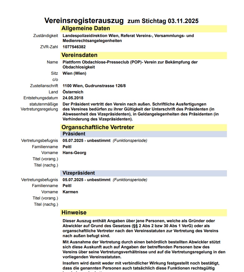Entstanden ist die Plattform Obdachlose - Presseclub (POP) 2001 aus der Notlage heraus unseres Präsidenten Hans-Georg Peitl, der damals nach einem Firmenkonkurs selbst in die Obdachlosigkeit schlitterte